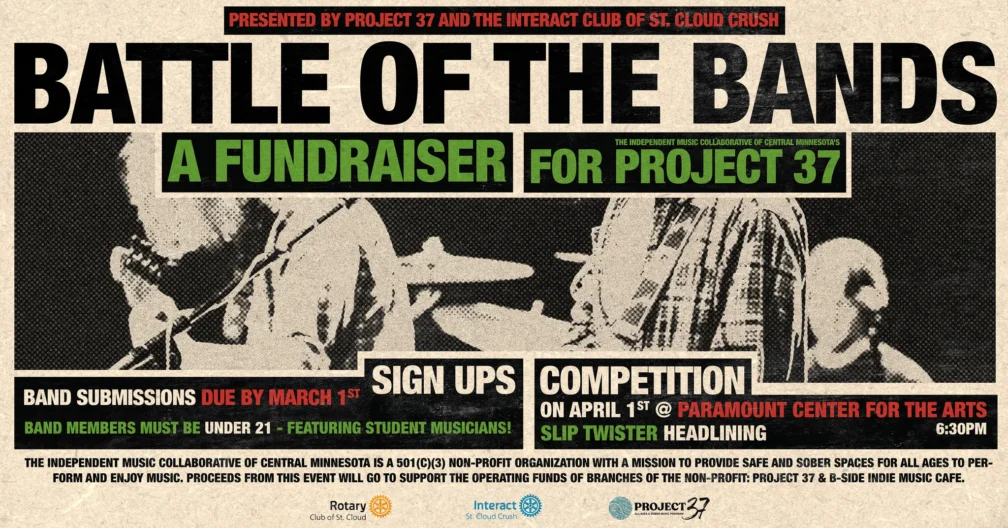 On WEDNESDAY, April 1st, join Project 37 & the Interact Club of St. Cloud Crush for their second annual BATTLE OF THE BANDS at the Paramount Center for the Arts at 6:30PM. SLIP TWISTER will be closing out this show with a rare performance!